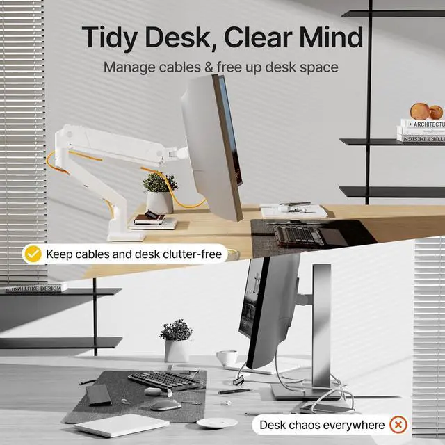Streamline Desktop Space: monTEK single monitor mount features a compact, low-profile base and elevated arm design, lifting your screen off the surface to free up valuable desk space. The ultrawide monitor arm also features integrated cable management, keeping power lines hidden and untangled, for a workspace that stays sleek, spacious, and clutter-free.
