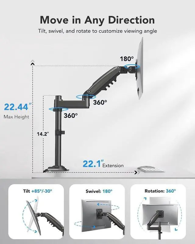 Fully Adjustable Single Monitor Stand: The single monitor mount offers +85° to -30° tilt, 180° swivel, 360° rotation. Compared with other adjustment methods that make you adjust screws repeatedly, huanuo vesa monitor mount is easy to adjust, just push the monitor arm up or down with only one hand to accurately stop at the most comfortable height for you (up to 22.44 inch from the desktop)!