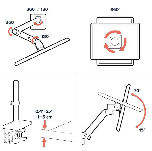 Versatile mounting options: Includes two-piece desk clamp to fit a variety of desk types; desk clamp attaches to desks 0.4 to 2.4 inches thick; grommet mount available as separate accessory (98-728-290)