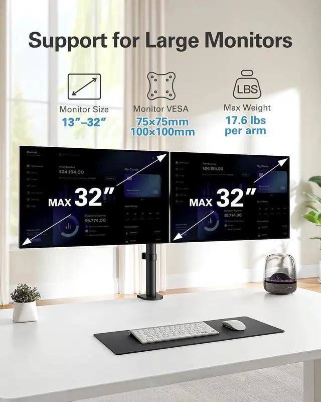 Maximize Desk Space: Raising monitors above your desktop can free up valuable space for other office essentials including your keyboard and mouse. The monitor arms for 2 monitors also features cable management clips to neatly route wires along the arms and pole for a clean and professional look.