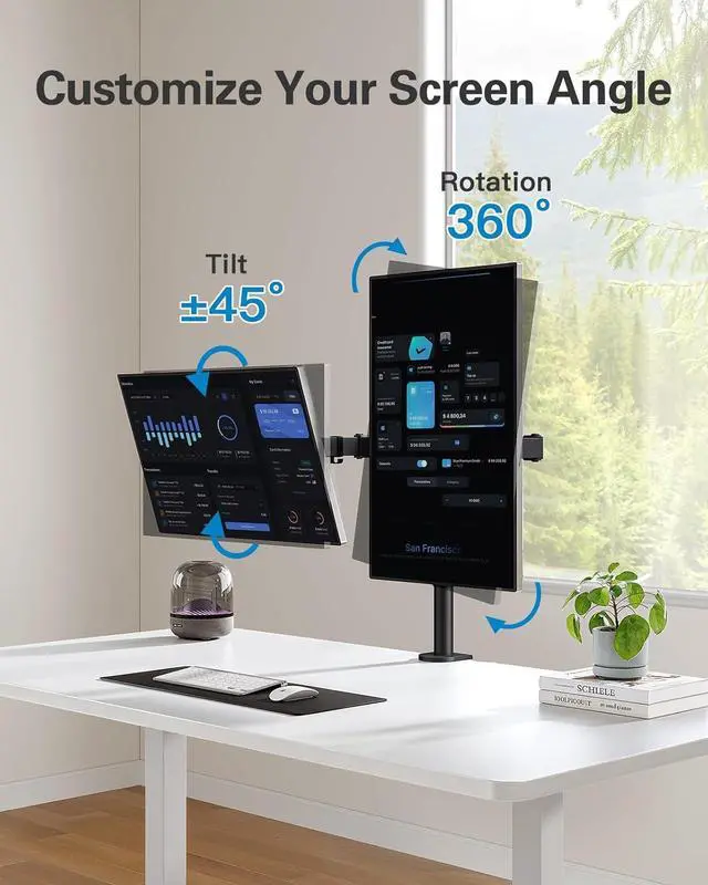 Find the Perfect Angle: The monitor holder features flexible arm joints that allow you to easily adjust screen angle with +/-90° side-to-side swivel for screen sharing, +/-45° tilt to help reduce glare, and 360° rotation for landscape or portrait mode. Position your screens at the exact angle that works best for you.