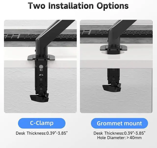 Two Mounting Options: Both C-clamp and grommet mounting are applicable for this product. The recommended thickness of the desk is 0.39 to 3.85 inch for C-Clamp installation and 0.39 to 3.85 inch for grommet installation. It also comes with the concealed cable management system to help organize unsightly cables.
