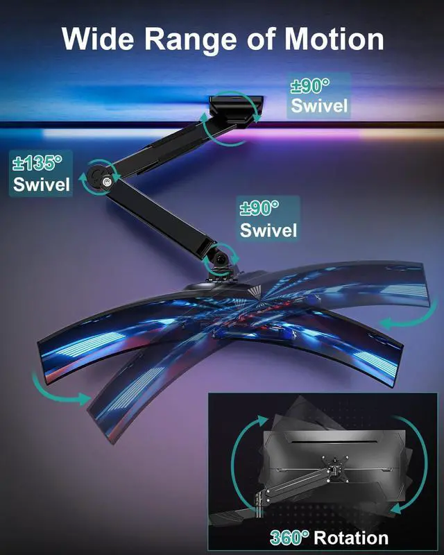 • Full Motion Adjustments - Our wall mount bracket with a range of flexible motion featuring 360°rotation for landscape or portrait mode, +90°/-90°tilt for the ideal screen angle, and +/-90°swivel for effortless screen sharing. It offers 13.2 of smooth adjustable height range with pneumatic spring lift. You can easily find the ideal monitor position and angle, which will enhance comfort and efficiency