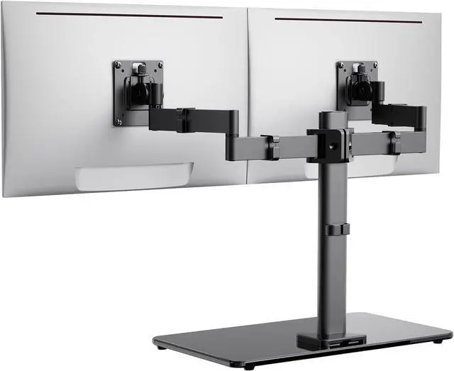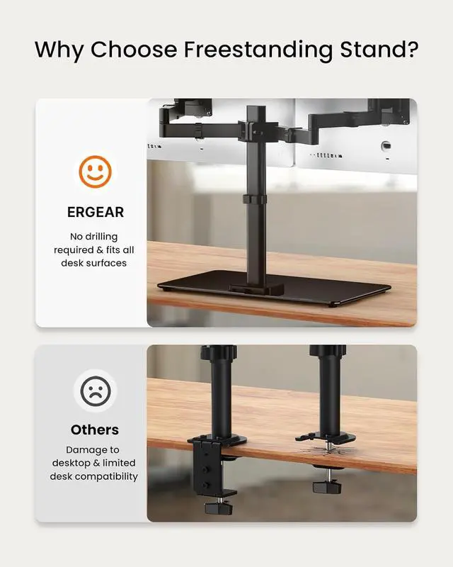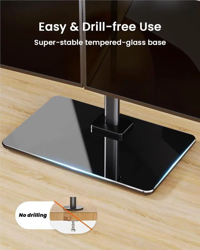 Convenient & Movable: This freestanding dual monitor stand can be placed directly on the desktop without the need for drilling. Unlike fixed stands, you can freely relocate it to another area or desk. The durable tempered-glass base is super-stable and adds a touch of style. Please follow the user manual to assemble the dual monitor stand.