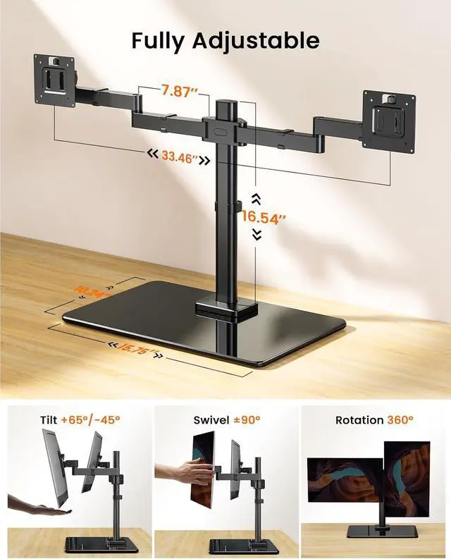 Adjustable Height for Comfort: This dual monitor stand for desk features a 16.54 center column for a wide height adjustment range. You can easily position your monitors at the right viewing height for better posture and ergonomic eye-level viewing comfort.