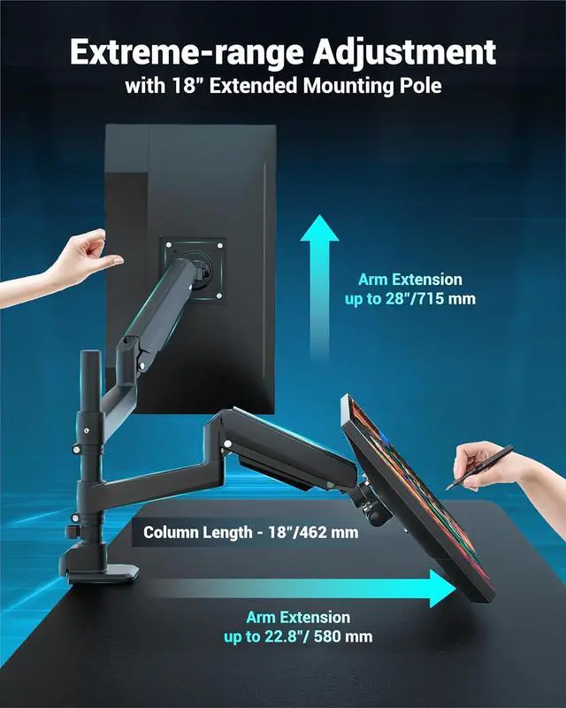 With 18" Tall Pole This ultrawide monitor mount offers unparalleled flexibility, allowing you to adjust the height 2.4 -28" ), rotation(360°), tilt(+90°/ -45°, and swivel180°. Achieve your ideal viewing position or configure dual screens in stacked/vertical layouts with effortless precision.