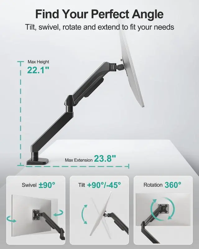 Full Motion & Ergonomic Design - Achieve the perfect viewing angle with -45° to +90° tilt, 360° rotation, and ±90° swivel. The 23.8 " extended arm reach allows you to position your ultrawide monitor exactly where you need it. It can elevate monitors up to 22.1 inches, giving you even more flexibility in customizing your workspace. Ideal for gaming and office work