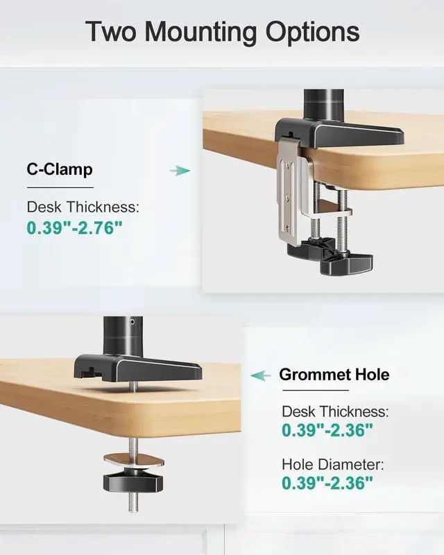 It supports two mounting options: a C-clamp for desks 0.39 " - 2.76 " thick and a grommet mount for 0.39 " - 2.36 " thick desks