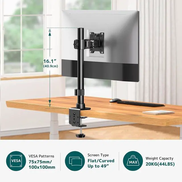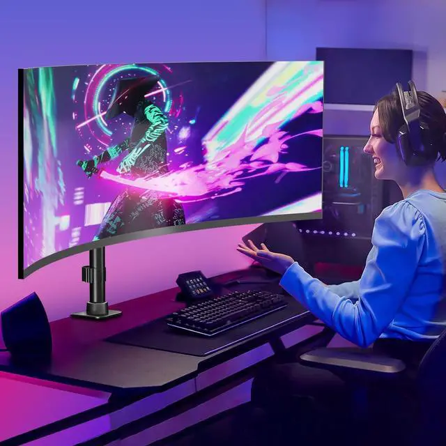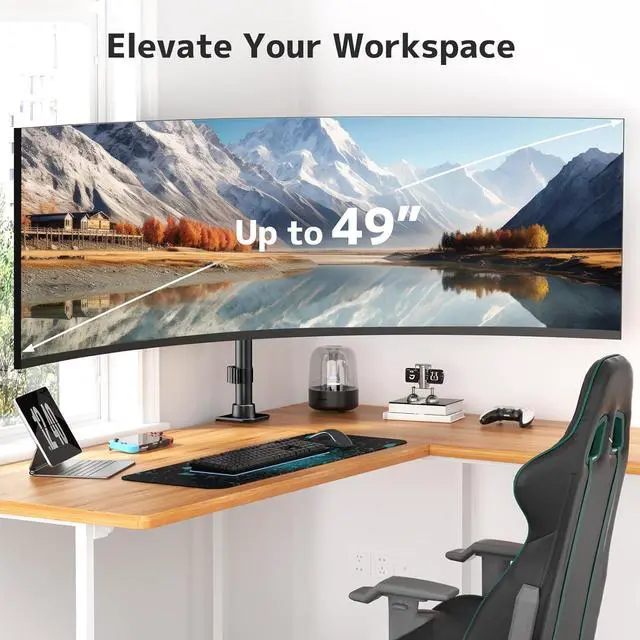 Designed for Ultrawide Monitors: This monitor mount accommodates most flat and curved screens ranging from 17 to 49 inches and weighing up to 44 pounds. It supports VESA patterns of 75x75 and 100x100 mm. The cable management system keeps cables neatly concealed for a tidy appearance.