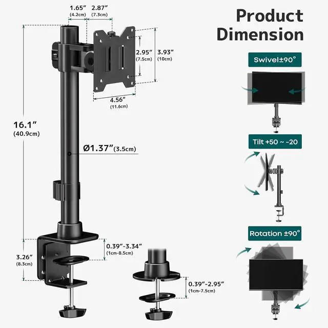 2 Installation Ways: The 2 methods of " C" clamp mount (fits desk 0.39 " to 3.3 " thick) and the grommet mount (Fits desk with thickness from 0.39 " to 3 " ).