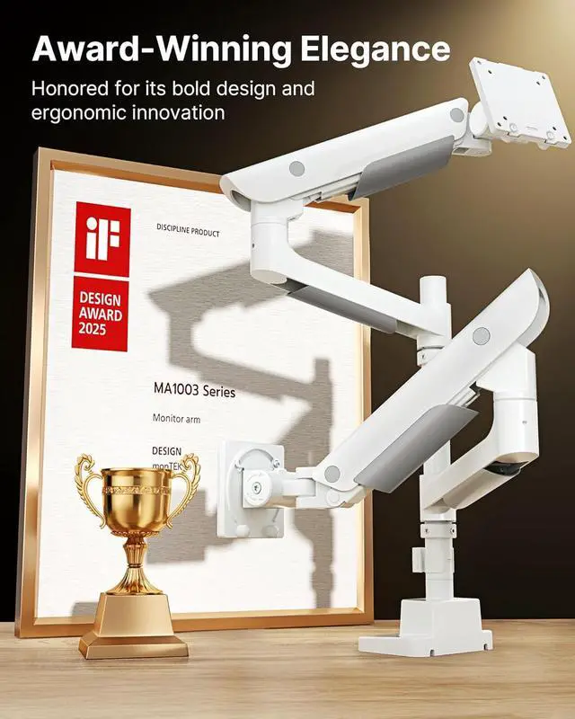 • Award-Winning Design & Premium Aluminum BuildCrafted from high-grade aluminum and honored with an iF Design Award, this monitor arm blends exceptional durability with refined aesthetics. The hidden gas spring tension port ensures a sleek look while enabling long-term strength and performance.