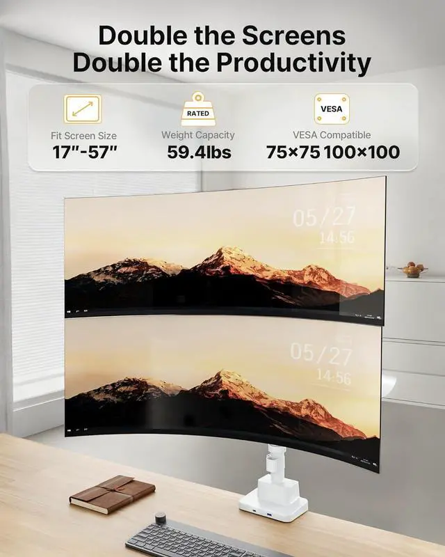 • Ultra-Stable Support up to 59.4 lbs & 57 DisplaysSupports monitors from 17" to 57" and up to 59.4 lbs, including ultrawide and curved displays. Compatible with both 75x75mm and 100x100mm VESA mounting patterns, this arm ensures a rock-solid hold and flexible adjustment for even the largest screens in your setup.
