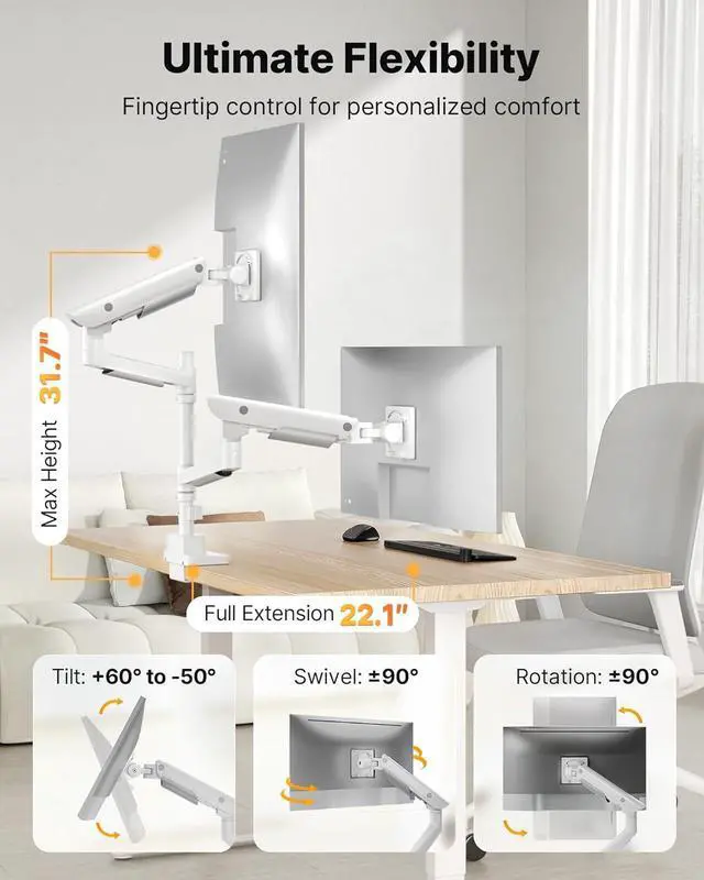 Ultra-Wide Flexible AdjustmentEnjoy effortless ergonomic tuning with tilt from +60° to -50°, ±90° swivel, and ±90° rotation. The upgraded one-way bearing head structure enables smoother motion and precise control. Extend the arm up to 19.1 or lift it to a max height of 21.9 with ease.