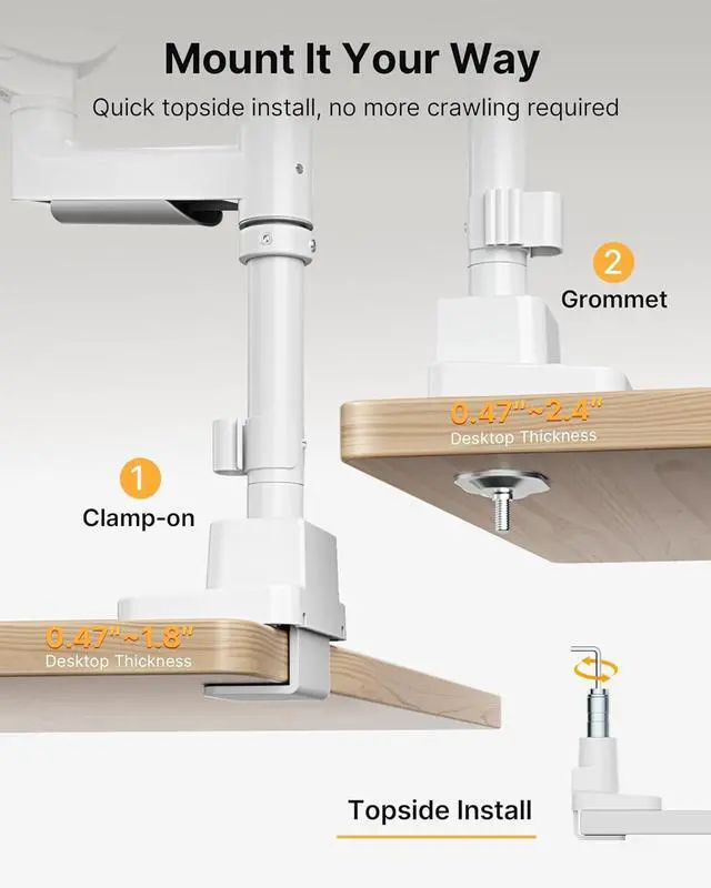 Quick 10-Min Assembly No Crawling Under DeskInstall in just 10 minutes using the topside-mounted C-clamp or grommetno need to reach under your desk. Features a tool-free quick-release VESA plate and detachable arm joint for a streamlined setup. Fits desks from 0.47 " to 1.8 " thick.