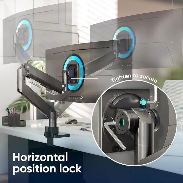 Wide Articulation Range This ultrawide monitor arm tilts from -20° to +60°, swivels 180°, and rotates 90° for portrait use. The computer monitor mount for desk supports C-clamp or grommet installation and adapts to every workspace layout.