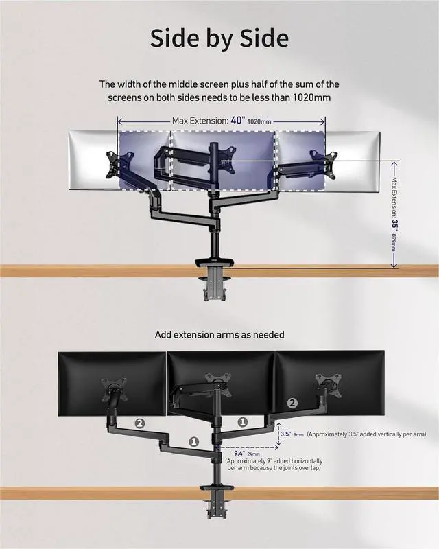 Maximize Desktop Space Since the long monitor arm offers swivel, tilt, and rotate adjustment, this 3 monitor stand can be retracted to the edge of the desk. Coupled with hidden cable management, a neat and functional workspace is always refreshing.
