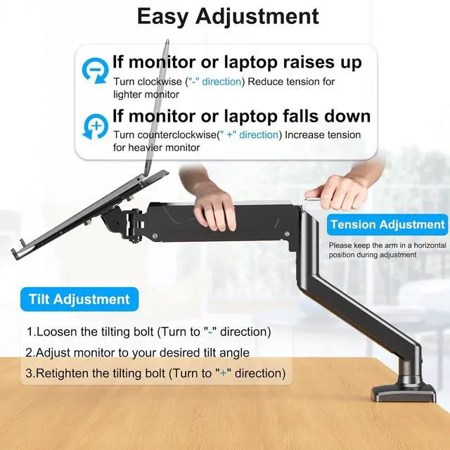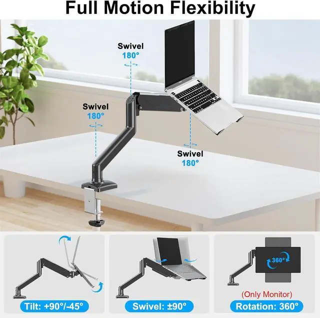 Full Motion Adjustable Laptop Mount - This monitor desk mount with gas spring arms offering a wider range of movement. The arm can extend up to 21.5 " long, and rise up to 16.3 " in height. Help you easy to find the suitable viewing angle and position. Features rotates 360° for landscape or portrait orientation, swivels 180° to share your display, and tilts up 45°/down 45°
