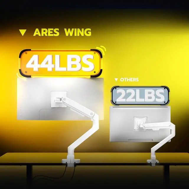 Support up to 49" & 44lbs MonitorsThe ARES WING single monitor arm has an optimized tilt structure, provides excellent weight-bearing capacity for ultra wide screens, including most of the popular 49" ultrawide flat and curved computer monitors. With a max. weight capacity of 44 lbs, it can securely support 17" -49" monitor (not for tv), and compatible with VESA 100x100 and 75x75mm. If your monitor does not have a VESA hole, you need to prepare a VESA mount adapter.