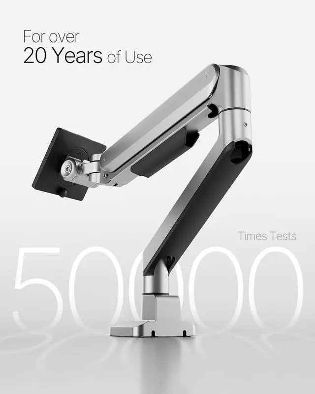 Sleek Aesthetic Meets 20-Year DurabilityExperience two decade of flawless performance while our single monitor arm delivers just as impressively and is backed by premium materials and rigorous testing. Unlike ordinary monitor arms, ours features a scratch-resistant aluminum body and is equipped with a high-end mechanical spring proven through 50, 000 cycles. This ensures smooth adjustments every day for over 20 years. Whats more, its sleek decorative design blends seamlessly with any workspace decor, making it the most reliable and visually appealing partner for your workspace.