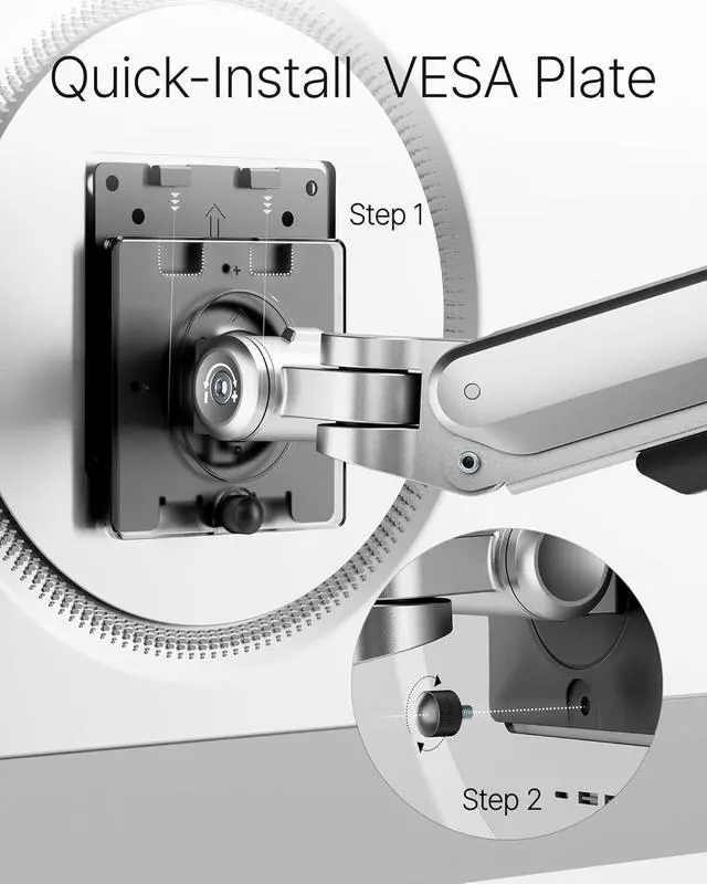• No Bending, Fast Setup: Install easily on your own with our topside-mounted C-clamp or grommet mounting options for the monitor arm, which eliminates the awkward need to reach under your desk. Plus, the tool-free quick-release VESA plate and detachable vesa monitor mount joint cut down on setup time for a smoother process, and it fits desks ranging from 0.47" to 2" thick to match most standard work
