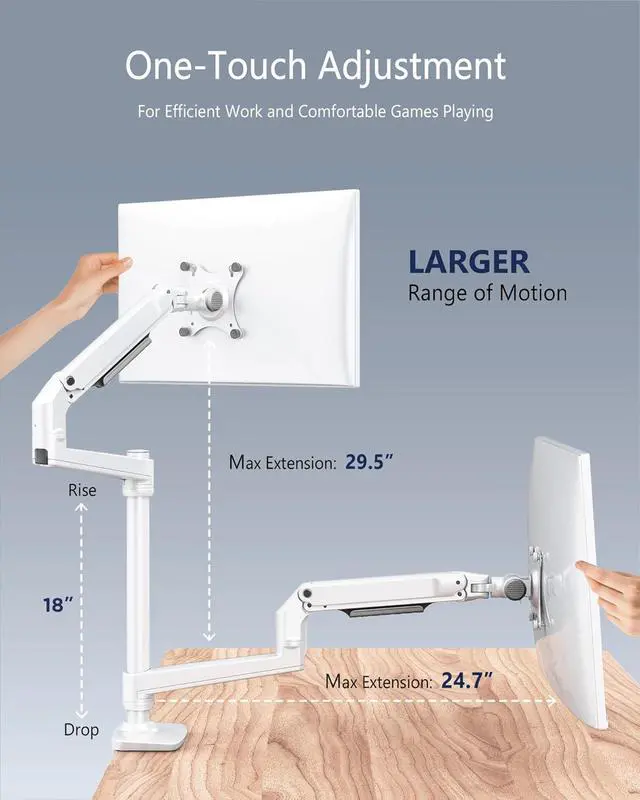 Quick Assembly & Ergonomic Design The E66 white monitor mount is not only easy to install. And as an ergonomic desk monitor mount, its also designed to comfort us by alleviating posture-related problems.