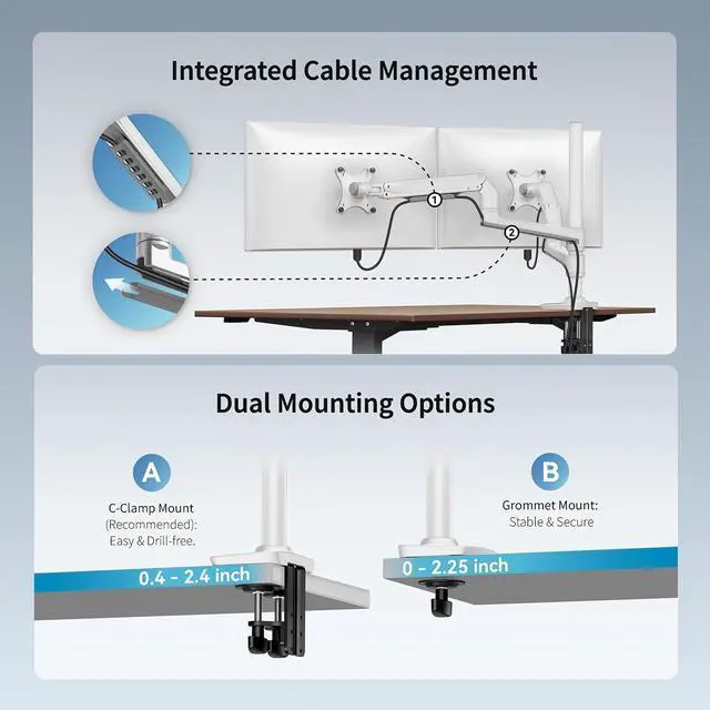 Broad Desktop Compatibility This 2 monitor desk mount provides powerful support for our monitors. C-clamp fits desks between 2/5 and 2 2/5 inches. The grommet base accommodates table tops up to 2 1/4 " thick.