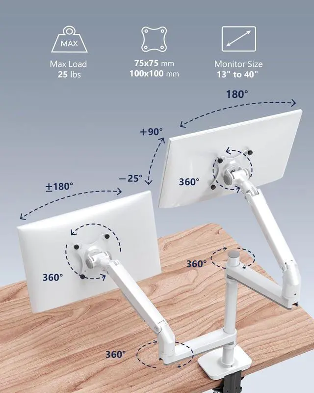 Maximize desktop space With two 360-degree swivel aluminum monitor arms, this VESA mount retracts around the edge of the desktop. A neat desktop is always refreshing, coupled with hidden cable management.