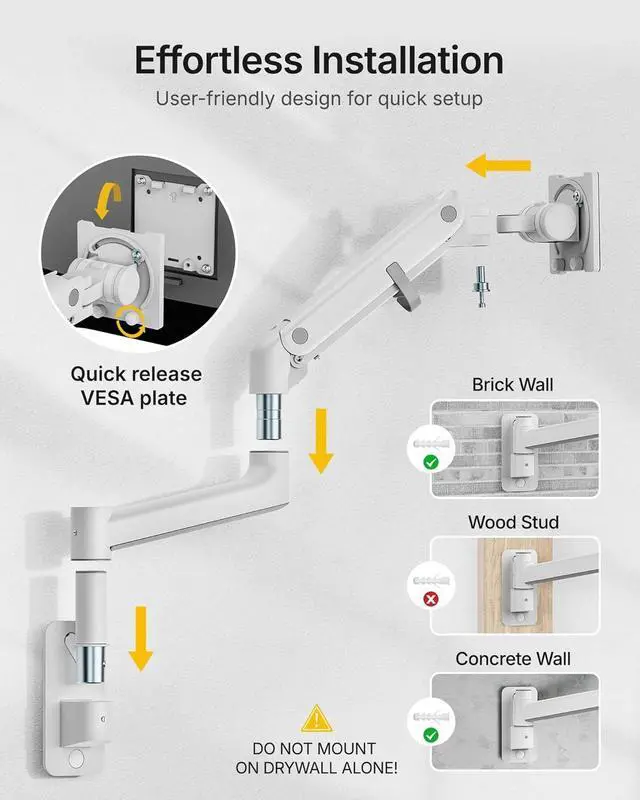 concrete walls (Note: Please do not mount to drywall alone). The quick-release VESA plate makes installation effortless, allowing you to set up this monitor wall mount within 10 minutes. Ideal for use in office, home, studio, gaming setup, and even RVs, which is a multifunctional tool to enhance your efficiency and productivity