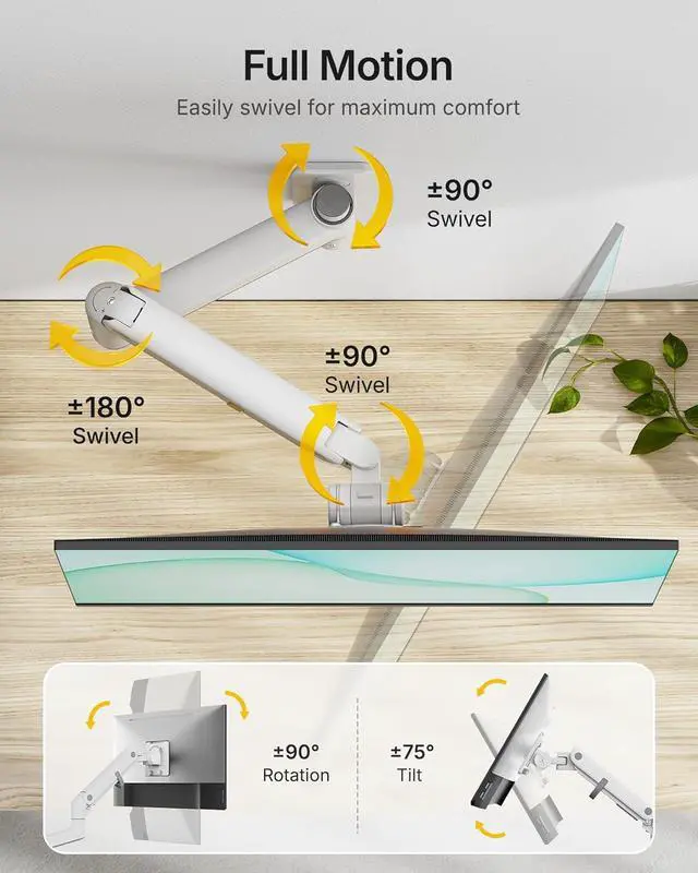 Full Motion AdjustmentsEnjoy unmatched flexibility with +75° to -75° tilt, ±90° swivel, 180° screen rotation. When not in use, the arm can be retracted close to the wall of only 5.2 ". This wall mount monitor arm extends up to 27.4 " with a 10.63 " height adjustment range, making it easy to find a more comfortable and ergonomic viewing angleperfect for long hours of work or gaming