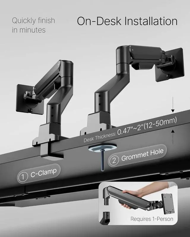 Fast Setup: Install easily on your own with our topside-mounted C-clamp or grommet mounting options for the monitor arm, which eliminates the awkward need to reach under your desk. Plus, the tool-free quick-release VESA plate and detachable vesa monitor mount joint cut down on setup time for a smoother process, and it fits desks ranging from 0.47 " to 2" thick to match most standard workspace setups.
