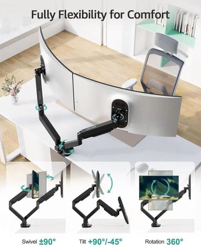 Get a Tidy Desk Space: This ultrawide monitor mount can hold two large screens, freeing up desktop space. The articulating arm can be folded back to save space in small areas. This frees up 50% more space for your laptop, cup, or other favorite desk decorations. There is also a cable management design under the arm to keep cables organized and protected. This dual monitor mount helps you say goodbye to clutter and give your desk a neat, organized new look!