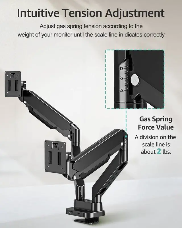 More Convenient Designs: In addition to supporting and adjusting the height, this monitor arm has other optimized features. Our monitor mount features two USB ports at the base and comes with a USB extension cable. Simply plug in your phone, tablet or laptop for quick charging or data transfer. We also added clear and numbered scales to the spring arm. Simply match the scale to your monitors weight for effortless tension and height control.