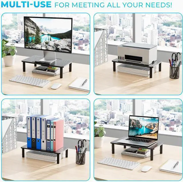EASY TOOL-FREE ASSEMBLY AND ADJUSTMENT: This monitor riser requires no tools for setup. Simply screw in the legs and press the button to adjust the height to your preferred level. Quick and easy assembly saves you time, making it perfect for fast, efficient use