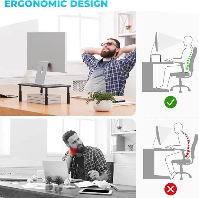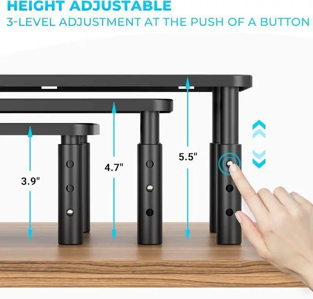 ERGONOMIC HEIGHT ADJUSTABLE DESIGN: The monitor stand features 3 adjustable height levels ( 3.9 - 4.7 - 5.5 in), allowing you to position your screen at the perfect eye level. This ergonomic design helps reduce neck, back, and eye strain during long work or study sessions. Easily adjust the height with a button press