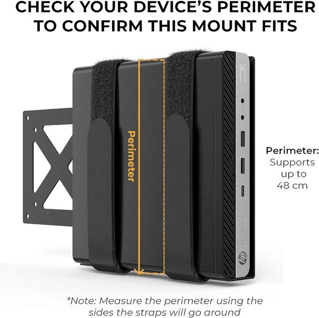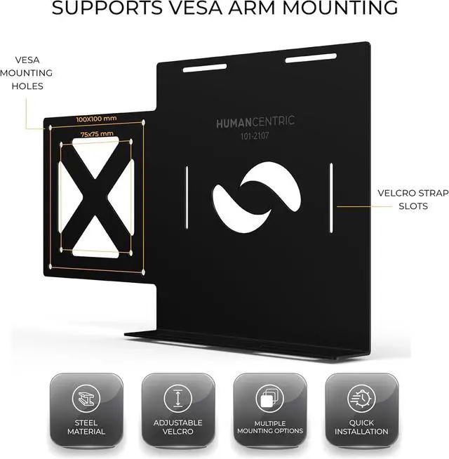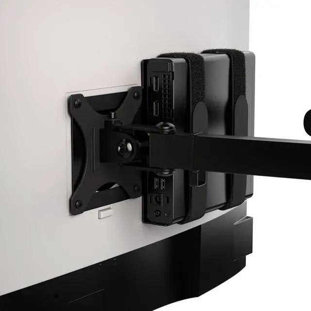 VESA mount: Mount your device between a VESA arm and monitor using this mount. Secure using the included Velcro straps via top to bottom or side to side mounting slots. Also works as a cable box wall mount behind tv or a router wall mount