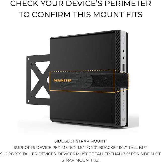 Side slot strap mounting: Supports devices with a perimeter of 11.5 " to 20". Device mount side is 7" tall but supports taller devices. Devices must be taller than 3.5 " for side slot strap mounting. See images for how to determine your devices perimeter.