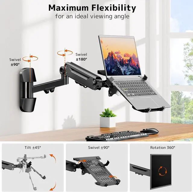 Full Motion Adjustability-90/+90° rotation, -45/+45° tilt, 21.6 " " extension range, and height-adjustable gas spring arm for ergonomic viewing angles, reducing neck & back strain