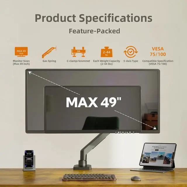 High load-bearing capacity and compatibility: The Claiks Single Monitor Arm is designed to fit most LCD/LED screens MAX 49", with a maximum load capacity of flat 44.4 lbs or curved 30.8 lbs. It supports standard VESA mounting patterns of 75x75mm and 100x100mm, ensuring compatibility with a wide range of monitors.