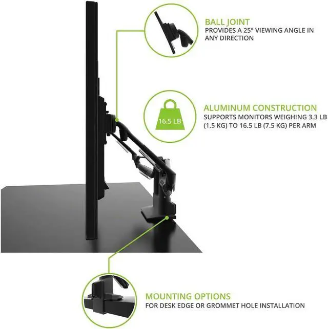 WIDE RANGE OF SUPPORT - Fits any desk edge or grommet hole up to 2" thick and supports monitors weighing 3.3 to 16.5 lb.