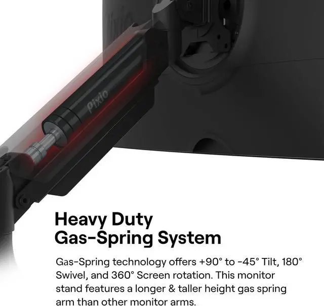 The arms offer full articulation: +90° to -45° tilt, 180° swivel, and 360° screen rotation. This monitor stand features a longer & taller height gas spring arm than other monitor arms, built for heavy duty application.