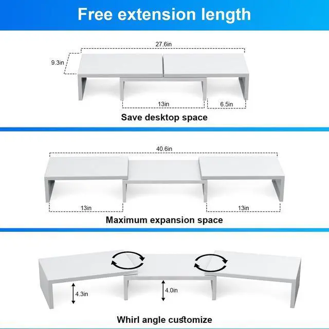 • Expand Desktop SpaceThe desk monitor stand increases your desktop storage space by elevating the monitor, optimizing storage efficiency. Customizable width allows you to adjust the distance between side shelves to control storage size and footprint, eliminating worries about limited desk space.