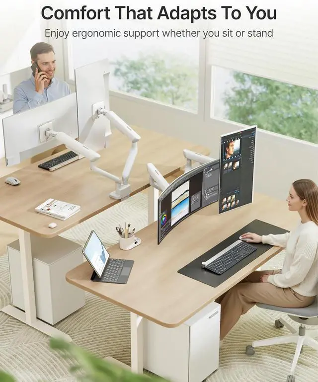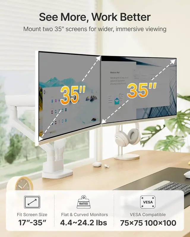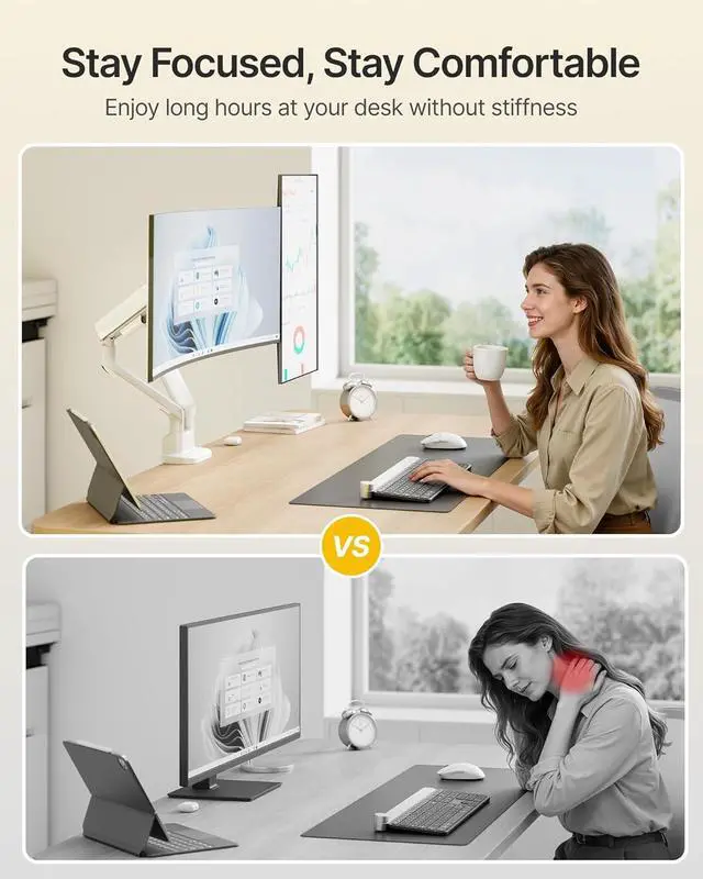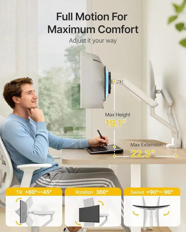 FULLY ADJUSTABLE FOR COMFORTABLE VIEWING: Enjoy total flexibility with -45° to +60° tilt, ±90° swivel, ±180° rotation, and 9.3 " 19.2 " height adjustment. This VESA dual monitor mount allows precise positioning for ergonomic comfortlift your screens to reduce neck strain, angle them for optimal viewing, and easily switch between tasks without eye fatigue.