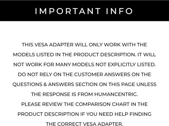 SE series monitors: This VESA adapter is tested and guaranteed to work with Dell model numbers S2318H, S2318HN, S2318HX, S2318NX, S2319H, S2319HN, S2218H, S2319NX, S2418HN, S2418HX, S2418NX.