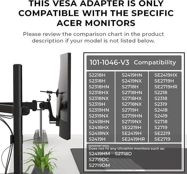 More compatibilities: SE2719HR, S2218, S2318, S2319, S2418, S2419, S2718, S2719, SE2219, and SE2719. Does not fit any Ultrathin monitors. If the fourth digit in your model number is a 6 or 7, this VESA adapter bracket will not work.