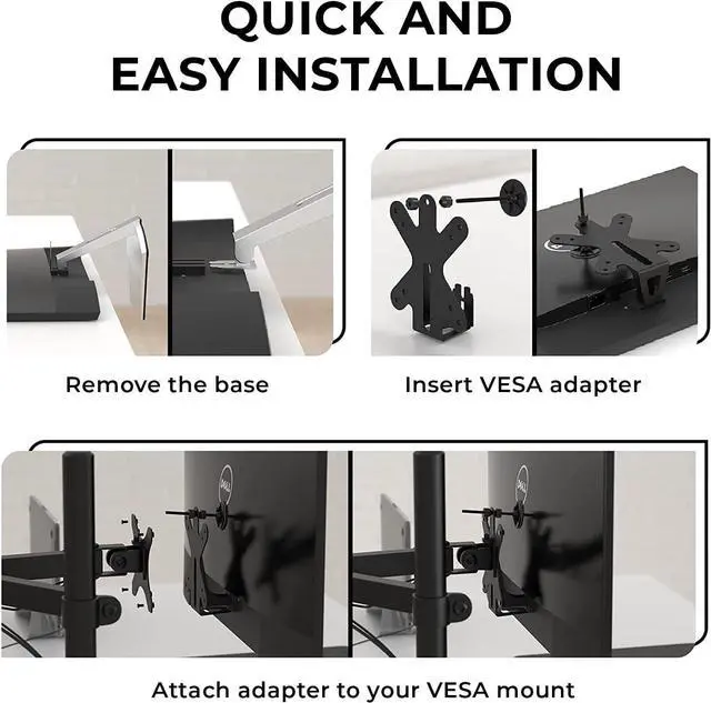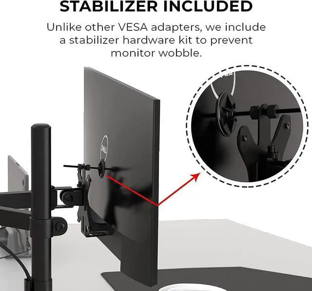 Use this VESA mount adapter to VESA mount Dell monitors to VESA arms, VESA stands, VESA desk mounts, and VESA wall mounts. The VESA adapter mount bracket fits standard monitor mounting sizes of 75x75 mm and 100x100 mm.