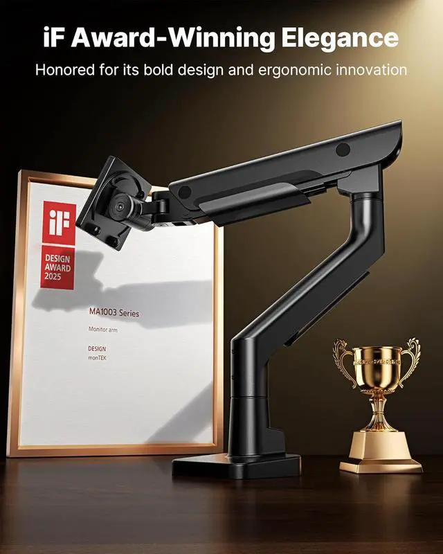 Award-Winning Design & Premium Aluminum BuildCrafted from high-grade aluminum and honored with an iF Design Award, this monitor arm blends exceptional durability with refined aesthetics. The hidden gas spring tension port ensures a sleek look while enabling long-term strength and performance.