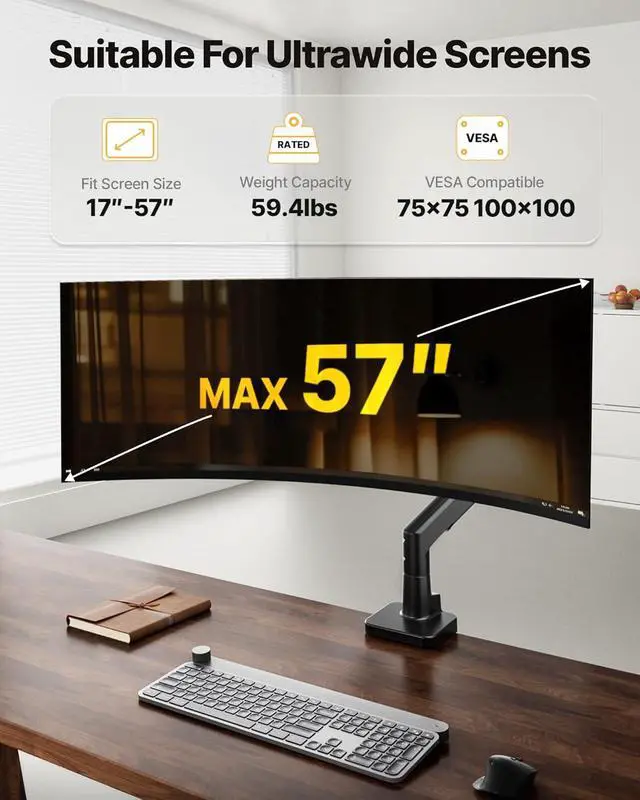 Ultra-Stable Support up to 59.4 lbs & 57 DisplaysSupports monitors from 17" to 57" and up to 59.4 lbs, including ultrawide and curved displays. Compatible with both 75x75mm and 100x100mm VESA mounting patterns, this arm ensures a rock-solid hold and flexible adjustment for even the largest screens in your setup.