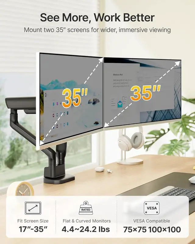 BROAD COMPATIBILITY FOR DUAL SCREENS: monTEK dual monitor arm fits most 17" 35" flat or curved screens, supporting up to 24.2 lbs per arm for stable, reliable performance. Fully compliant with VESA 75×75mm and 100×100mm mounting patterns. Ideal for office workstations, home setups, and gaming rigs, this dual monitor mount adapts seamlessly to various environments and screen types.