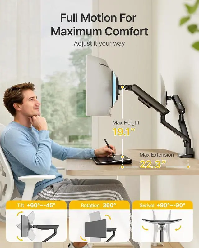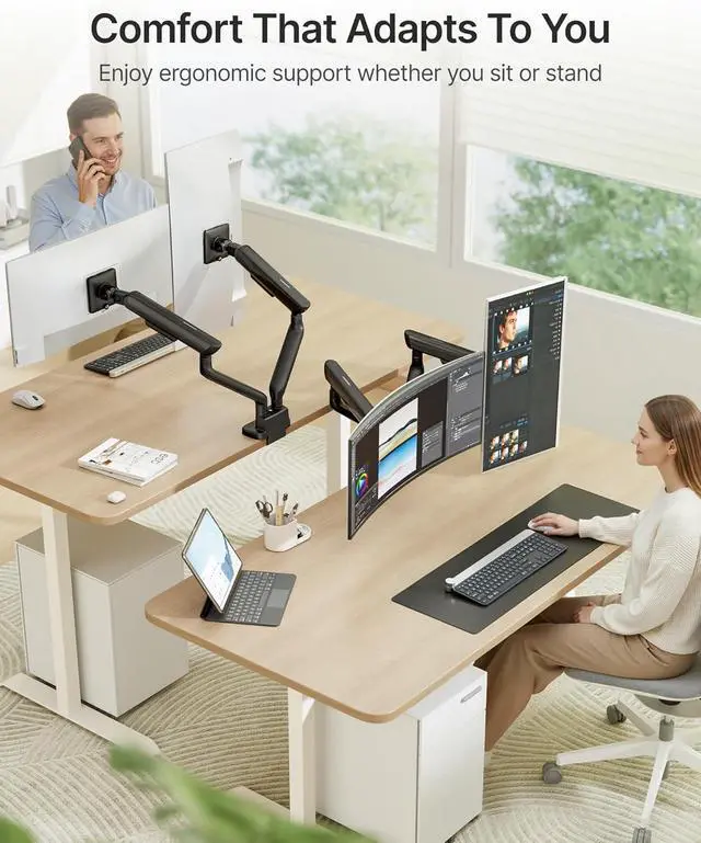 FULLY ADJUSTABLE FOR COMFORTABLE VIEWING: Enjoy total flexibility with -45° to +60° tilt, ±90° swivel, ±180° rotation, and 9.3 " 19.2 " height adjustment. This VESA dual monitor mount allows precise positioning for ergonomic comfortlift your screens to reduce neck strain, angle them for optimal viewing, and easily switch between tasks without eye fatigue.