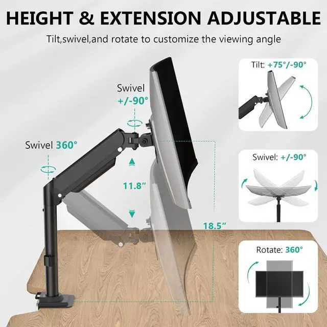 Flexible Adjustability: Effortlessly position your screen for optimal viewing comfort. Featuring a wide tilt range (+75° to -90°), smooth swivel (±90°), and 360° rotation, this arm allows you to customize the perfect angle for any task. This flexibility aligns perfectly with both sitting and standing desks, supporting your comfort throughout the workday. Perfect for coding, reading documents, or browsing diverse content with optimal comfort.